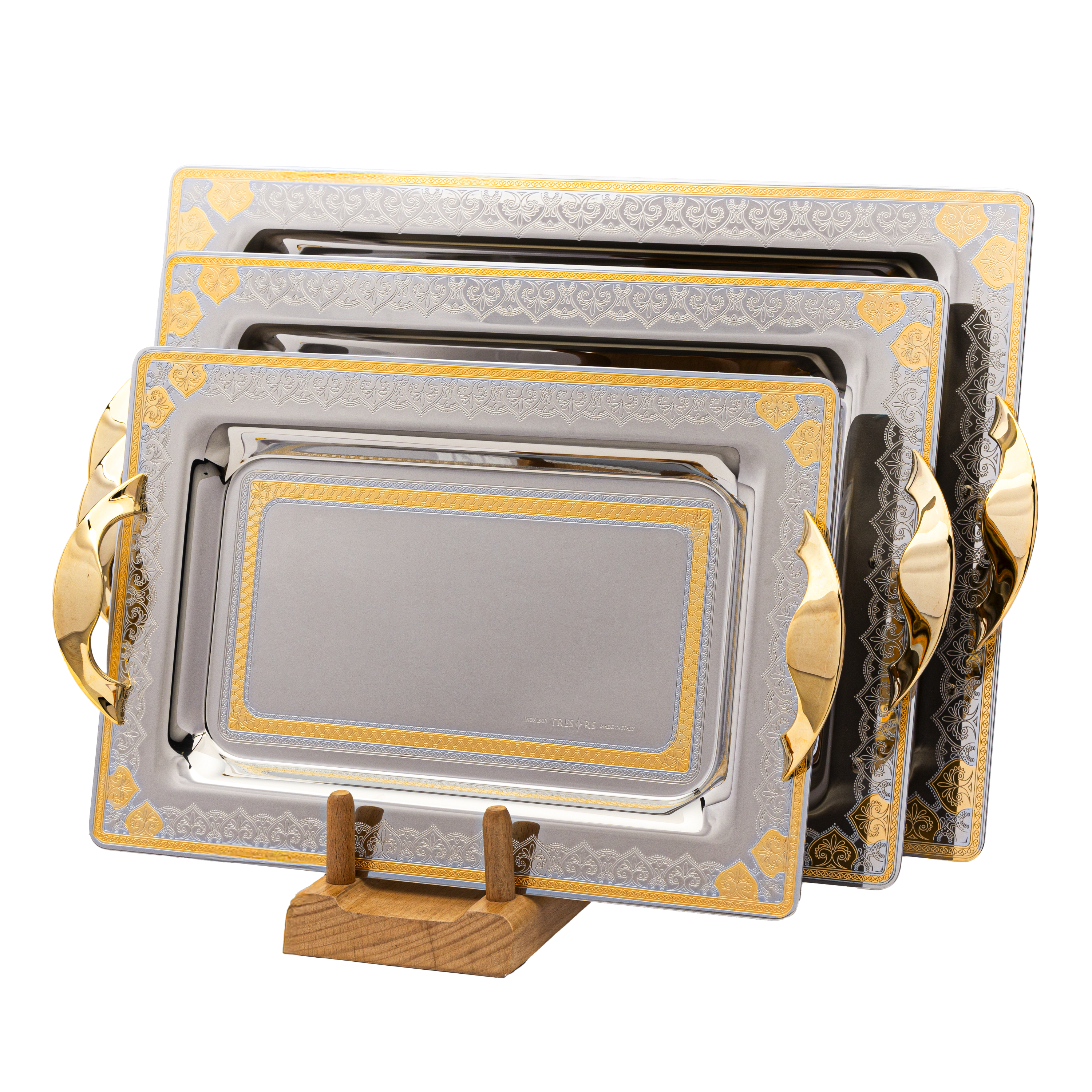 Item: Tresors Rectangular Tray with Handles, 3 Pieces -Made in Italy -Silver & Gold -Stainless Steel 18/10